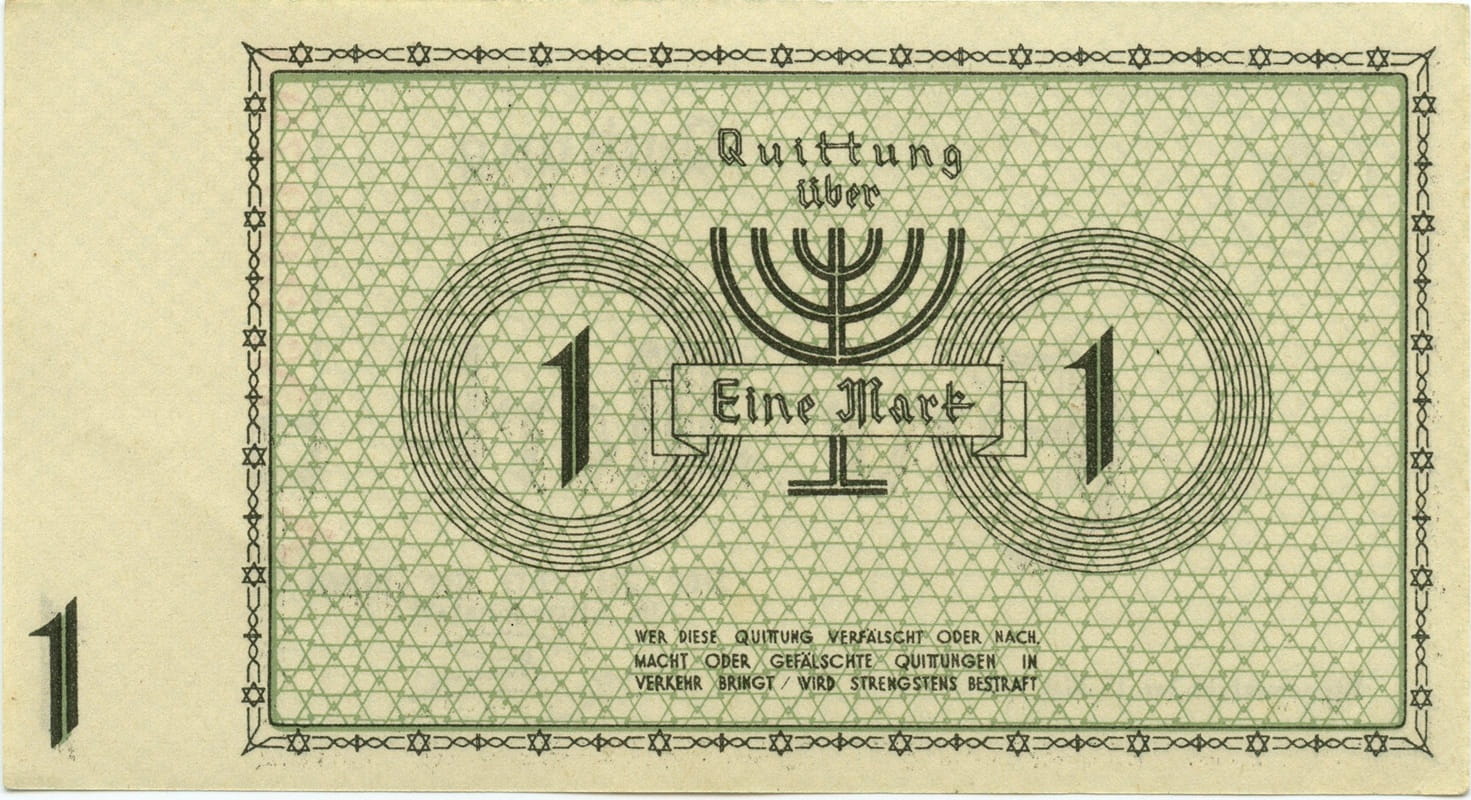 W lewym dolnym rogu nominał banknotu 1. Na środku banknotu Minora - świecznik siedmioramienny. Po jego prawej i lewej stronie w kilku okręgach nominał 1 oraz słownie w prostokącie napis: Eine Mark
