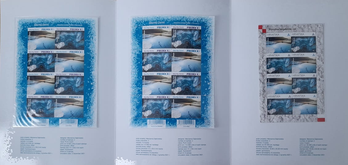 Skarby ziemi Arkusz 8 znaczków wykonany offsetową techniką druku. Arkusz zawiera 8 znaczków po 4 z każdego z dwóch rodzajów. Na jednym znaczku została przedstawiona Kopalnia Soli w Bochni oraz kryształki soli kamiennej, a na drugim Solana Ston w Chorwacji i sól pozyskiwaną z morza. Emisja tej pozycji została wypuszczona wspólnie z Pocztą Chorwacji.