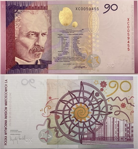 W prawym dolnym rogu powołany budynek Państwowych Zakładów graficznych. Przy lewej krawędzi pionowo napis: Polska Wytwórnia Papierów Wartościowych S.A. W centralnej części banknotu i na prawym boku fantazyjne wzory graficzne. W prawym górnym rogu liczba 90, która symbolizuje rocznicę utworzenia poprzednika Państwowej Wytwórni Papierów Wartościowych