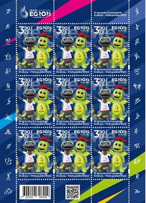 III Igrzyska Europejskie Kraków - Małopolska 2023 r. - arkusz znaczków kolekcjonerskich o ograniczonym nakładzie pojedynczego znaczka 126 000 szt. w formacie 31,25 mm x 43, 00 mm, materiał papier fluorescencyjny, technika druku offsetowa. Arkusz 9 powtarzających się znaczków niestemplowany w układzie 3x3, perforowany, stan zachowania nowy