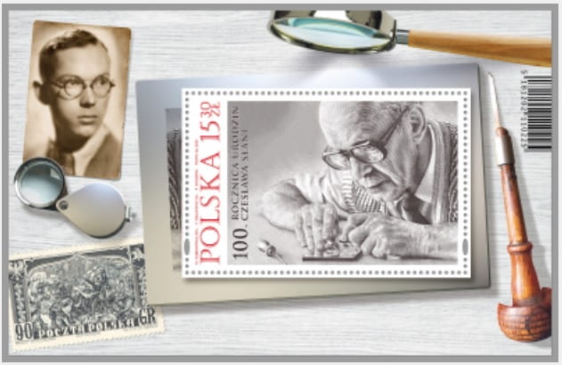 Zdjęcie Czesława Słani podczas wykonywania pracy nad nowym znaczkiem. Obok pionowo w dwóch rzędach dużymi literami napisy: 100. rocznica urodzin Czesława Słani. Przy lewej krawędzi znaczka dużymi literami czerwoną czcionką napis: Polska. Nad nim nominał znaczka 15,30 zł