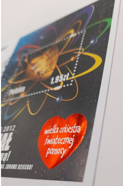 Na znaczku: Na znaczku w bloku serduszko w kolorze złotym wśród stylizowanych symbolicznych orbit ciał niebieskich w kosmosie