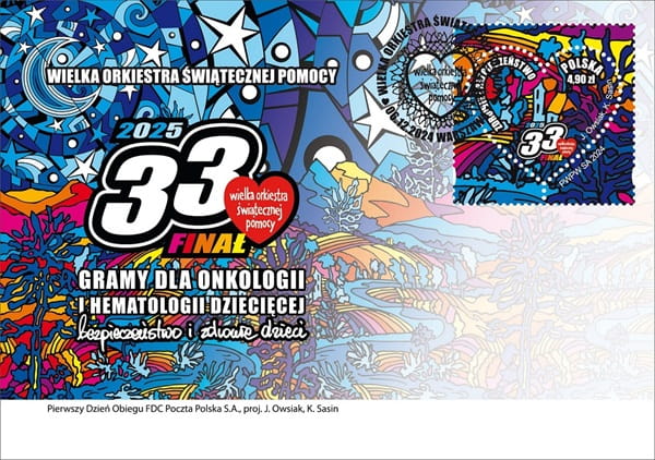 Koperta FDC z pierwszego dnia obiegu ze stemplem okolicznościowym z kategorii koperty FDC oraz znaczkiem w formacie znaczka 45,00 mm x 45,00 mm w ograniczonym nakładzie znaczka 144 000 sztuk, projektant Jerzy Owsiak, Katarzyna Sasin. Nakład koperty znacznie niższy, stan zachowania nowy