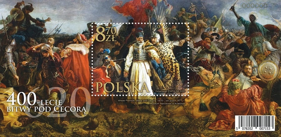 Fragment obrazu Witolda Piwnickiego pod tytułem "Bitwa pod Cecorą", gdzie na pierwszym planie widnieje hetman Stanisław Żółkiewski w czasie bitwy pod Cecorą w 1620 roku. W lewym górnym rogu nominał znaczka 8,70 zł. U dołu po lewej stronie dużymi literami złotą czcionką napis: Polska