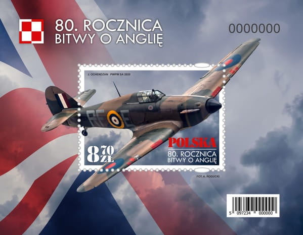 Samolot bojowy podczas lotu. W lewym dolnym rogu nominał znaczka 8,70 zł, w prawym dolnym rogu napis dużymi literami: Polska, a poniżej w dwóch rzędach napis: 90. Rocznica bitwy o Anglię. Na bloczku z lewej strony stylizowany fragment flagi Królestwa Brytyjskiego, po prawej stronie błękit nieba z chmurami.