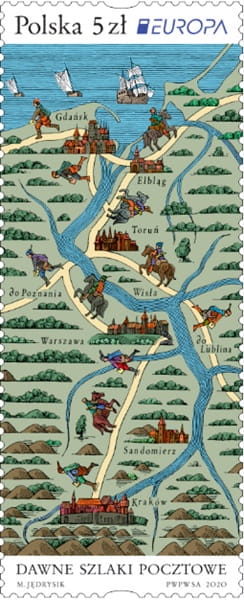 Na nim grafika, mapa przestawiająca trasę Gdańsk - Kraków z przedstawieniem stylizowanych konturów miast. Stylizowane postacie gońców pocztowych na koniach oraz pieszych. Stylizowana grafika drzew, gór, rzeki Wisła oraz morza ze statkami. U góry znaczka napis Polska nominał znaczka 5 złotych oraz napis / logo EUROPA. U dołu znaczka poziomo dużymi literami na białym tle napis: Dawne szlaki pocztowe oraz w prawym lewym rogu nazwę projektanta znaczka M. Jędrysik, a prawym PWPW 2020.