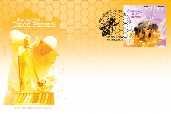 Szata graficzna koperty w odcieniach żółci i bieli. Od góry stylizowane plastry mionu. Po lewej stronie u góry w dwóch rzędach napis: Światowy / Dzień Pszczół. Poniżej pszczelarz podczas prac przy ulu. Na samym dole napisy dużymi literami: Pierwszy dzień obiegu Poczta Polska S.A. Przy lewej krawędzi koperty pionowo w górę dużymi literami napis: proj. A Grosik
