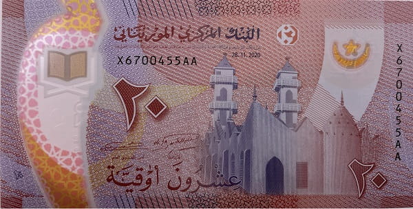 20 ouguyia 2020 r. - banknot 20 ouguyia Mauretania z kategorii obiegowe banknoty świata kontynent Afryka, materiał polimer stan zachowania UNC