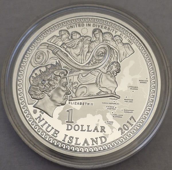 Po lewej stronie głowa królowej Elżbiety II w koronie z prawego profilu. Przy szyi znak mennicy: m/w oraz litery IRB. Poniżej zaokrąglony napis dużymi literami: Niue Island oraz rok emisji monety 2017. Nad napisem nominał monety 1 dollar. Obok twarzy królowej napis: Elizabeth II. W tle grafika z mapą Europy i oznaczeniem głównych miast dawnego szlaku bursztynowego
