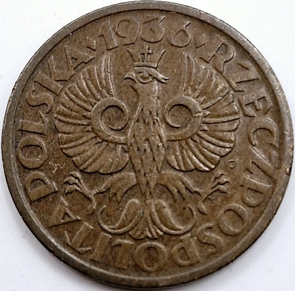 Na awersie w centrum widnieje orzeł w koronie ustanowiony dla godła Rzeczypospolitej Polskiej. W otoku monety przy jej rancie napis dużymi literami: Rzeczpospolita Polska oraz rok emisji monety 1936 u góry przy rancie. Nad łapami orła inicjały projektanta, po lewej stronie W po prawej stronie J. Między szponami ówczesny znak mennicy strzała - herb Kościesza