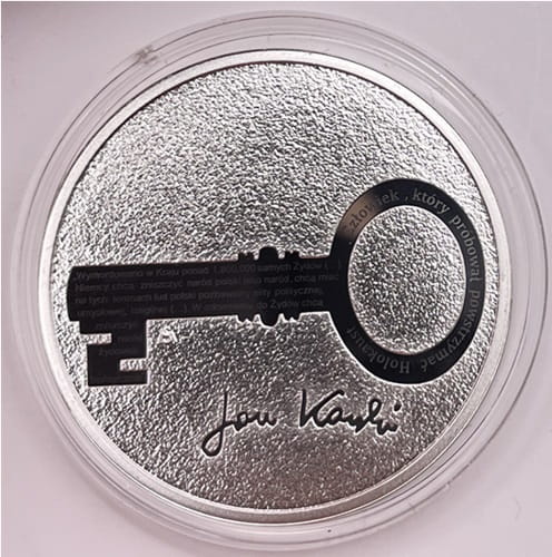 Na rewersie na środku klucz z mikrotekstem, nawiązujący do wydrążonego klucza, w którym Jan Karski przemycał mikrofilmy z raportem o sytuacji Żydów