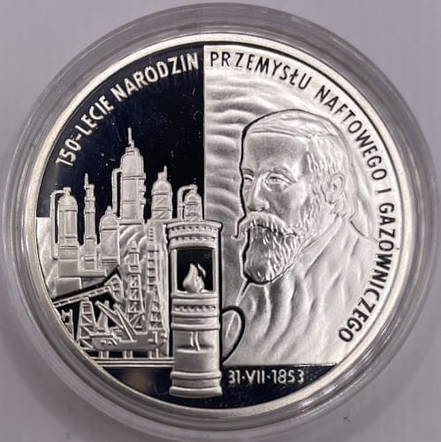 150-lecie narodzin przemysłu naftowego Ignacy Łukasiewicz - srebrna moneta kolekcjonerska 10 złotych NBP - Narodowy Bank Polski, producent Mennica Polska S.A., temat indywidualny, stempel lustrzany, stan zachowania L/L