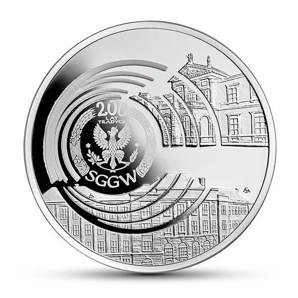 Rewers: Na rewersie monety w centralnym miejscu przedstawiono logo obchodów 200-lecia SGGW. W górnej części monety zarys Pałacu Ursynowskiego, obecnej siedziby władz uczelni, który jest wizytówką kampusu uczelni. Poniżej widać budynek SGGW przy ul. Rakowieckiej.