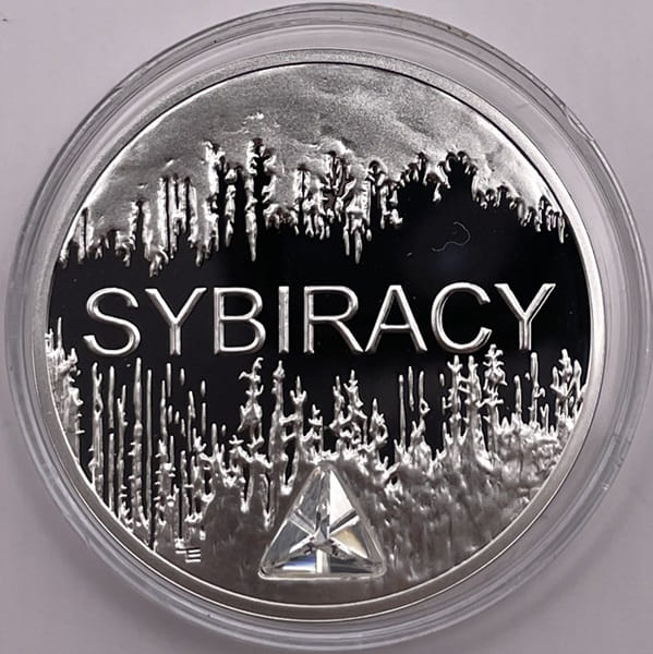 Na rewersie monety stylizowane wizerunek drzew oraz oszronionej roślinności. Przez środek monety dużymi literami napis: SYBIRACY. U dołu monety przy jej rancie cyrkonia symbolizująca kryształek lodu