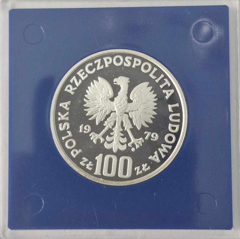 Srebrna moneta kolekcjonerska Polska Rzeczpospolita Ludowa, temat indywidualny, nominał 100 złotych, stempel lustrzany, metal / stop srebro pudełko, średnica monety 33 mm, masa 17,60 gram, rok emisji 1979, wielkość emisji, stan zachowania L/L