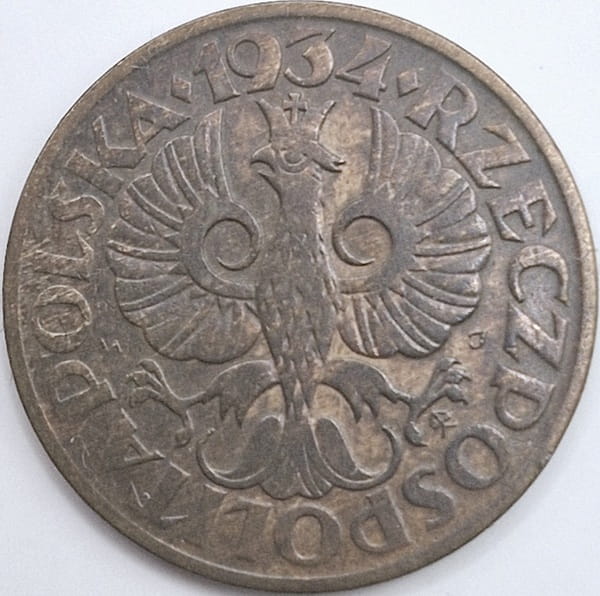 Na awersie w centrum widnieje orzeł w koronie ustanowiony dla godła Rzeczypospolitej Polskiej. W otoku monety przy jej rancie napis dużymi literami: Rzeczpospolita Polska oraz rok emisji monety 1934 u góry przy rancie. Nad łapami orła inicjały projektanta, po lewej stronie W po prawej stronie J. Między szponami ówczesny znak mennicy strzała - herb Kościesza