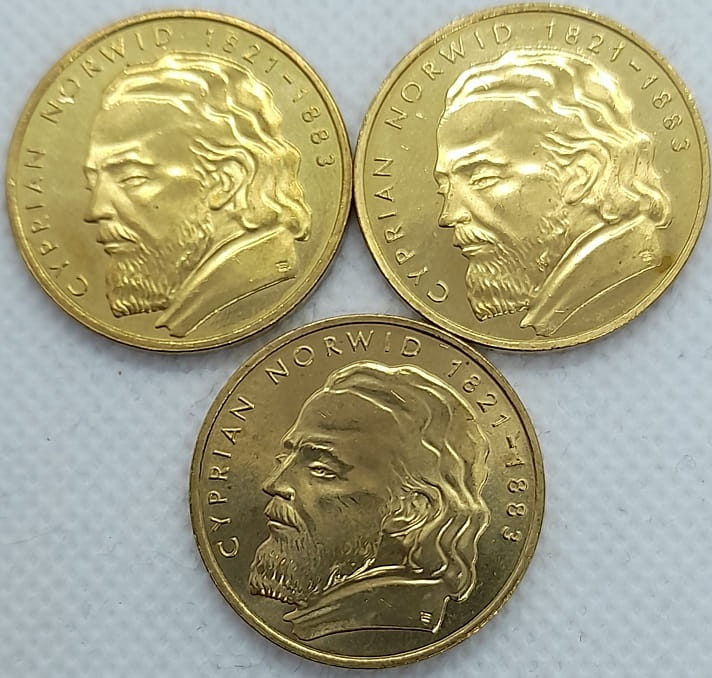 Na rewersie głowa Cypriana Norwida widok z lewego profilu. W otoku monety przy rancie napis: CYPRIAN NORWID 1821 - 1883.