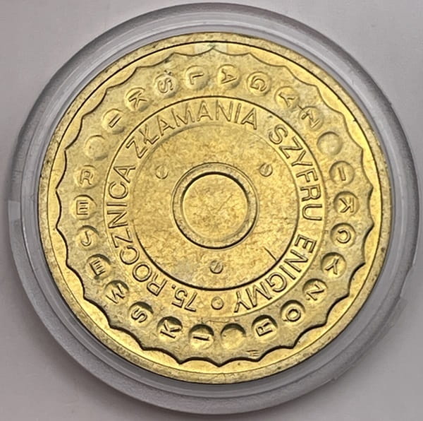Stylizowane koło wirnika szyfrującego Enigmy. Na obwodzie w kółkach napis: REJEWSKI RÓŻYCKI ZYGALSKI. Wokół środka napis: 75. ROCZNICA ZŁAMANIA SZYFRU ENIGMY.