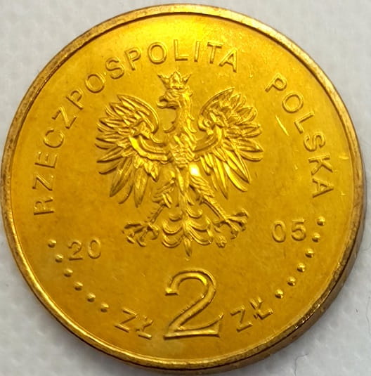 Na awersie monety wizerunek orła w koronie ustalony dla godła Rzeczypospolitej Polskiej. Po bokach orła rok emisji monety: 20-05. Pod orłem nominał monety w zapisie: ZŁ 2 ZŁ, w otoku przy rancie monety napis: RZECZPOSPOLITA POLSKA poprzedzony oraz zakończony sześcioma perełkami. Pod lewą łapą orła znak mennicy: m/w