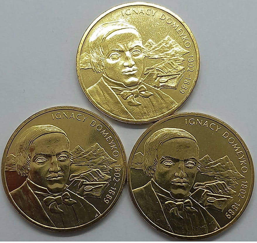 Na rewersie stylizowane popiersie Ignacego Domeyki z portretu A. Kurowskiego z 1833 r. W tle Ignacego Domeyki stylizowany wizerunek gór, a także przybory pracy jak torba, książka, młotek oraz lupa. Od góry monety, ku prawemu dołowi napis półkolem dużymi literami: Ignacy Domeyko 1802-1889