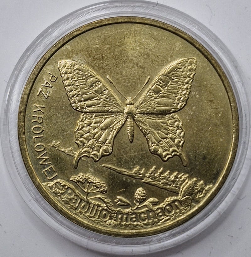 Na rewersie w centralnej części wizerunek pazia królowej. W tle fragment lasu. U dołu fragment łąki oraz półkolem napis: PAŹ KRÓLOWEJ - Papilio machaon