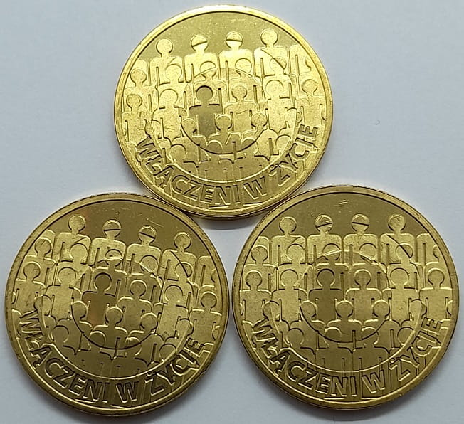 Na rewersie stylizowane postacie ludzi ustawione obok siebie oraz w kilku rzędach. Wpisane koła w obraz rewersu. U dołu monety napis WŁĄCZENI W ŻYCIE.