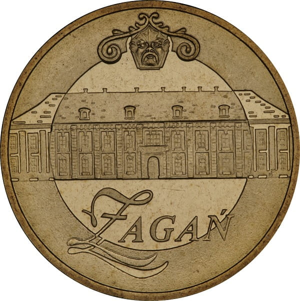 Na rewersie w jej centrum widnieje stylizowany wizerunek elewacji frontowej Pałacu Książęcego w Żaganiu. U góry monety stylizowany wizerunek jednego z maszkaronów oraz element architektury z okna pałacu. U dołu monety poziomo stylizowany napis: ŻAGAŃ