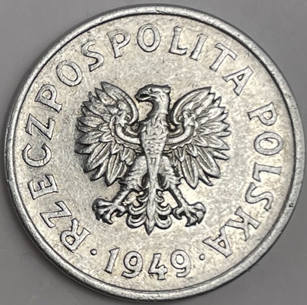 Na awersie monety w jej centrum widnieje orzeł bez korony ustanowiony dla godła Rzeczypospolitej Polskiej. W otoku monety przy jej rancie napis dużymi literami: Rzeczpospolita Polska oraz rok emisji monety 1949 przy rancie u dołu między kropkami. Standardowo dla tej monety brak znaku mennicy