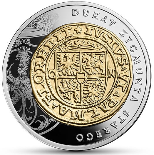 Na rewersie widnieje stylizowany rewers dukata Zygmunta Starego selektywnie złocony. Po lewej stronie monety stylizowany orzeł pod koroną wykonany techniką mikrodruku na wzór wizerunku z drzeworytu z XVI wieku. Po prawej stronie przy rancie półkolem od góry w dół napis: DUKAT ZYGMUNTA STAREGO