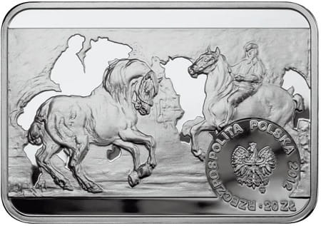 Awers: Na awersie monety w prawym dolnym rogu wizerunek orła w koronie, godło ustalone dla Rzeczpospolitej Polskiej. W otoku napis dużymi literami Rzeczpospolita Polska rok emisji 2012 oraz nominał monety 20 złotych. Z lewej strony monety stylizowany obraz pt. "Stajenni z koniem i psem". Pod lewą łapą orła znak mennicy: m/w