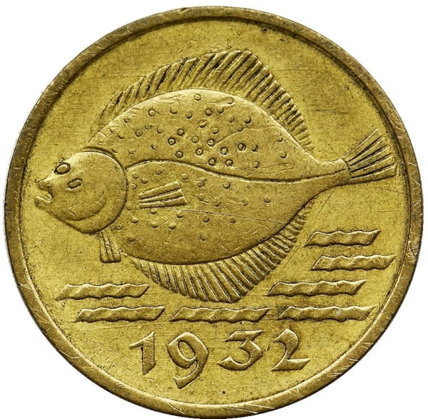 Awers: Na awersie monety u góry stylizowany wizerunek ryby flądra, którą otaczają stylizowane fala w kilku rzędach, u dołu monety przy jej rancie rok emisji 1932