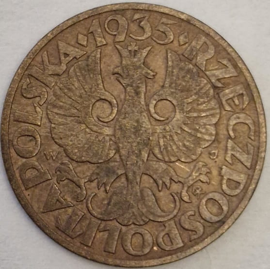 5 groszy 1935 r. - moneta obiegowa z okresu II Rzeczpospolitej Polskiej, metal brąz, emitent Bank Polski, producent Mennica Państwowa, stempel zwykły, stan zachowania +3, real foto