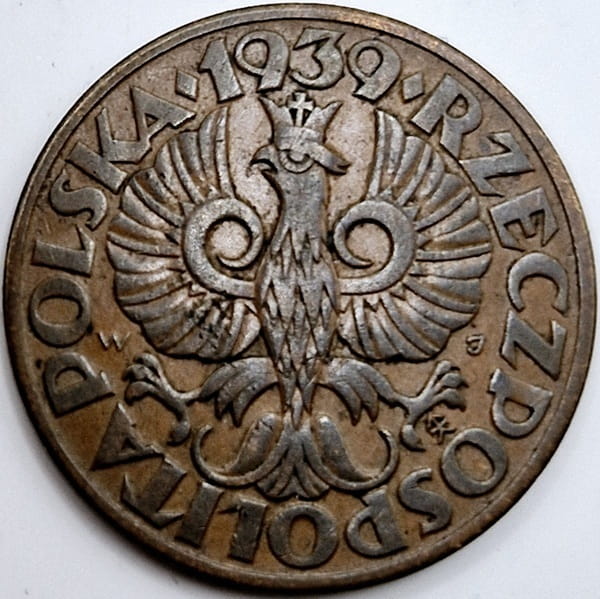 5 groszy 1939 r. - moneta obiegowa z okresu II Rzeczpospolitej Polskiej, metal brąz, emitent Bank Polski, producent Mennica Państwowa, stempel zwykły, stan zachowania -2/+3, real foto