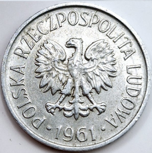 5 groszy 1961 r. - moneta obiegowa z okresu II Rzeczpospolitej Polskiej, metal aluminium, emitent Bank Polski, stempel zwykły, stan zachowania 2