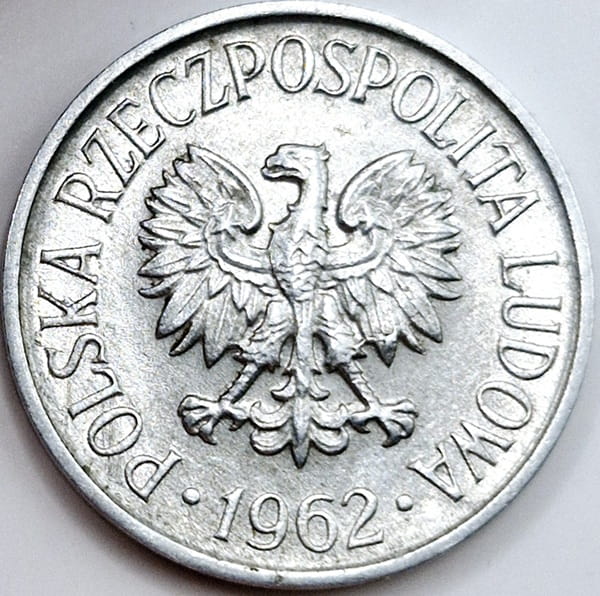 5 groszy 1962 r. - moneta obiegowa z okresu II Rzeczpospolitej Polskiej, metal aluminium, emitent Bank Polski, stempel zwykły, stan zachowania 2/+2
