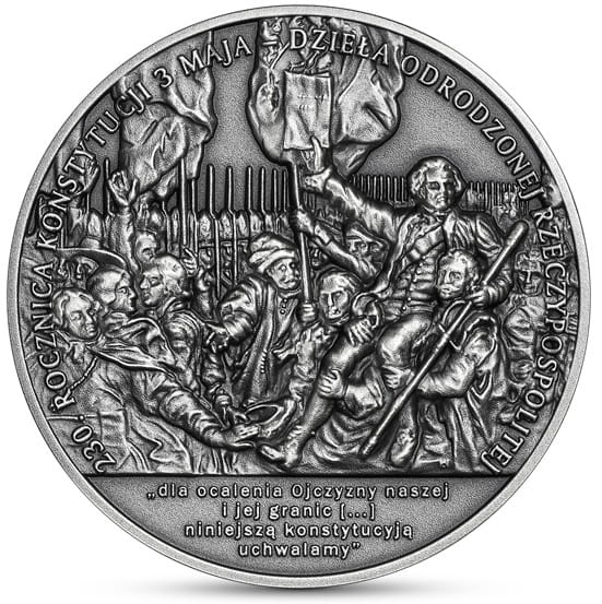 Na rewersie monety stylizowany fragment sceny z obrazu Konstytucja 3 maja 1794 roku Jana Matejki. Niesiony przez tłum na rękach na pierwszym planie marszałek Sejmu Czteroletniego Stanisław Małachowski, trzyma w ręku tekst Ustawy Rządowej 3 maja. U dołu monety na wyodrębnionym tle fragment preambuły konstytucji.
