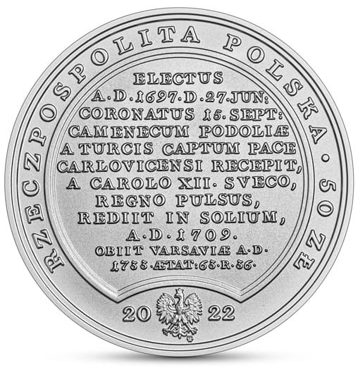 50 złotych August II Mocny 2022 r. - srebrna monet kolekcjonerska 50 złotych NBP, producent Mennica Polska S.A., z serii Sarby Stanisława Augusta, numer 21 z 24, stempel zwykły, moneta w pudełku z certyfikatem i folderem emisyjnym, stan zachowania menniczy