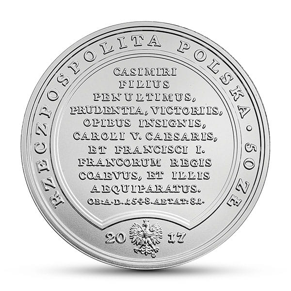 Na awersie monety czytamy nieznacznie skrócony tekst z rewersu medalu (w tłumaczeniu): Przedostatni syn Kazimierza, odznaczający się roztropnością, zwycięstwami i majątkiem, współczesny Karolowi V cesarzowi i Franciszkowi I królowi francuskiemu, i im równy. Umarł Roku Pańskiego 1548, mając lat 81, w 42. roku panowania, dnia 1 kwietnia.