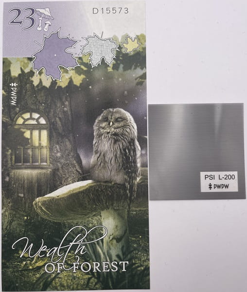Sowa 2023 r. - banknot testowy którego producentem jest Państwowa Wytwórnia Papierów Wartościowych, materiał papier, banknot w folderze emisyjnym, stan zachowania banknotu UNC, stan 1