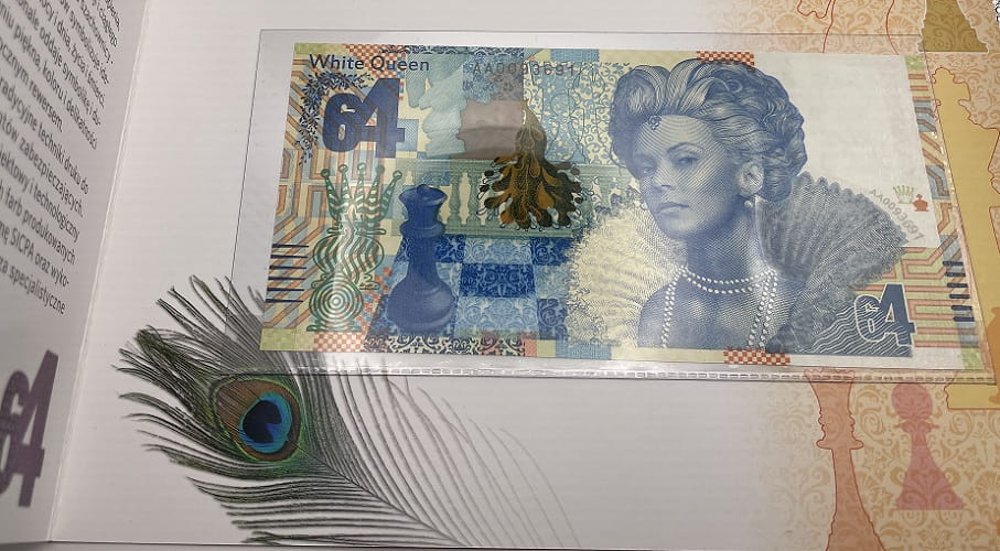 Szachy 2017 r. - banknot testowy w tzw. małym folderze emisyjnym, producent i emitent Państwowa Wytwórnia Papierów Wartościowych, materiał papier, stan zachowania UNC / stan 1