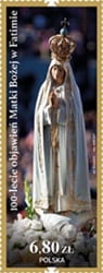 Wizerunek figurki Matki Boskiej Fatimskiej. U dołu nominał znaczka 6,8 zł oraz napis dużymi białymi literami: Polska. Po lewej stronie dużymi literami pionowo od dołu w górę napisy: 100-lecie objawień Matki Boskiej Fatimskiej